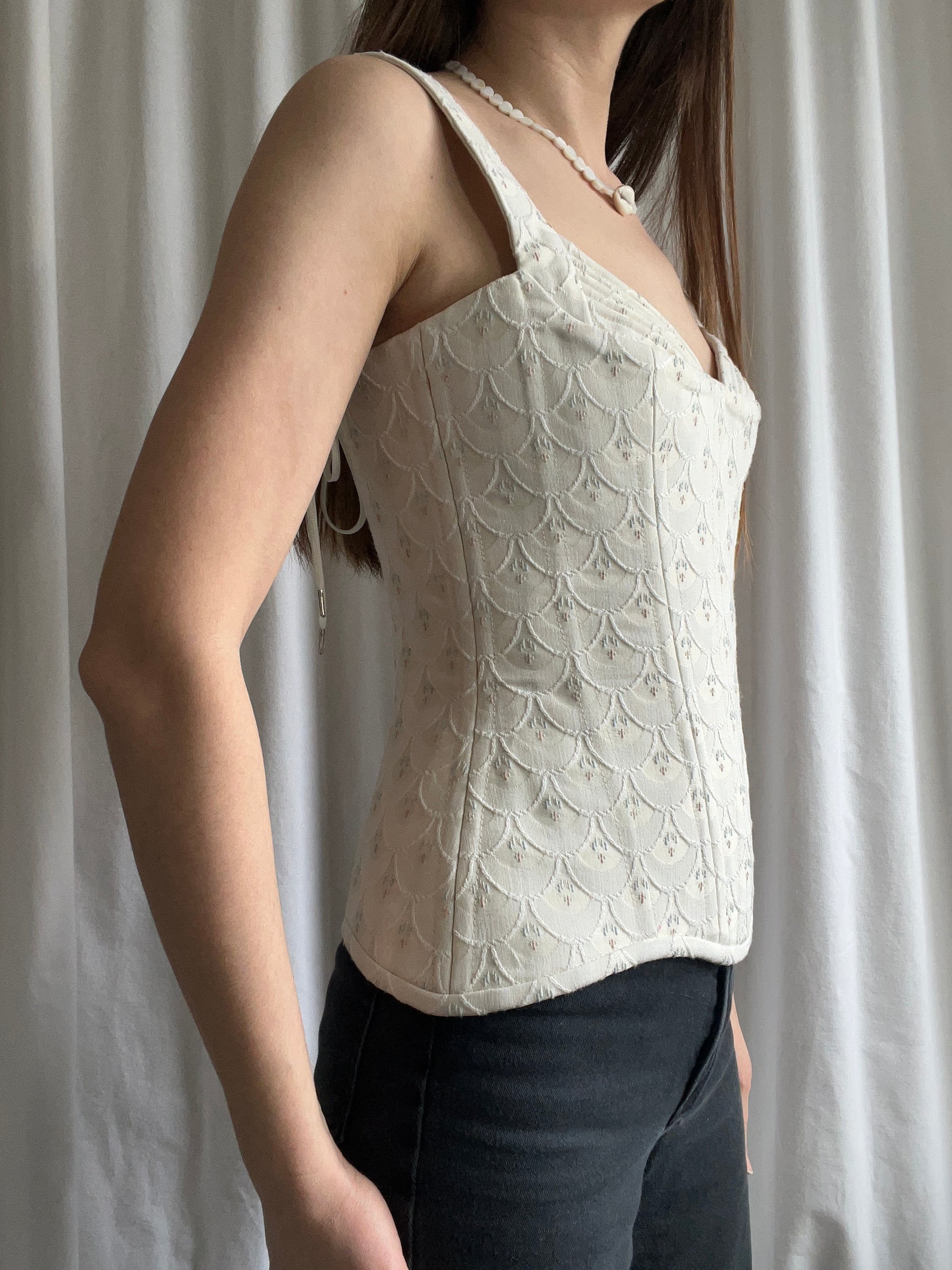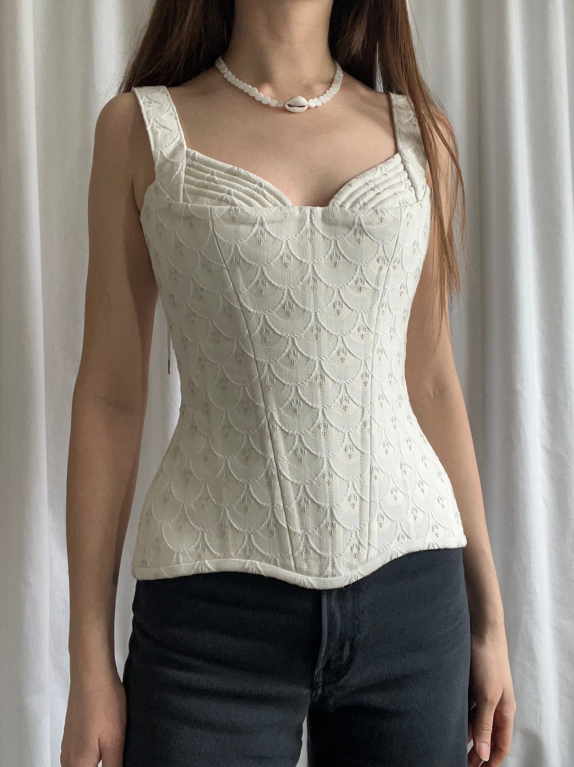 This handmade corset is timeless femininity. Crafted from a delicately textured outer fabric with an unknown fiber content, it is fully lined with 100% cotton for comfort and breathability.